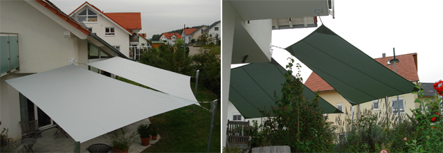 Zwei trapezförmige Sonnensegel nebeneinander montiert. Mit Detailfotos (siehe Info Datei)