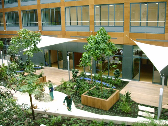 Verschiedene Sonnensegel in der neu gestalteten Vorhalle der Sparkasse Hagen.