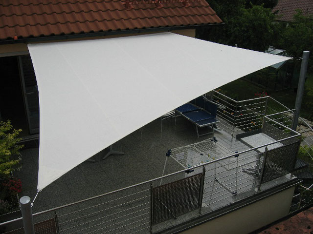 Sonnensegel in Freiform - befestigt an Dachsparren, Spindeltreppenholm und Stahlrohr an Wand,Terasse dadurch nur teilweise beschattet.