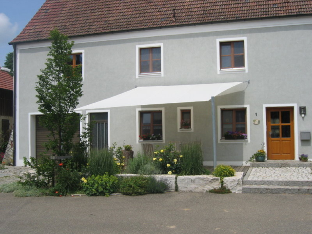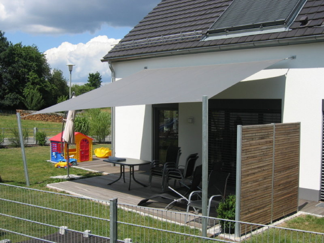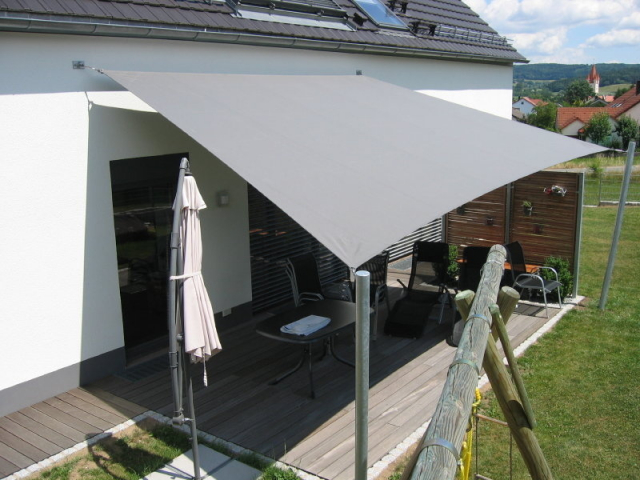 Durch den Hohlsaum rings-herum wird ein Edelstahldrahtseil gezogen und die beiden Seilenden dessen mit Drahtseilklemmen verbunden. Dadurch kann das Sonnensegel mit Hilfe der Spannschlösser ohne Werkzeug ein-, als auch ausgehängt werden.