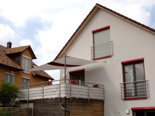 An den Ecken eingebrachte Eckverstärkungen in der Farbe des gewählten Stoffes machen Ihr Sonnensegel besonders wind- als auch reißfest und gehören zur Ausstattung jedes Hofsäß Sonnensegels.