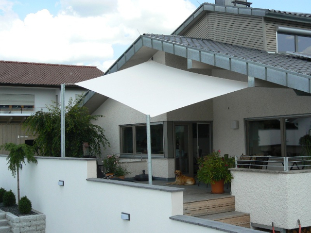 Der gleichzeitig formschöne konkave Schnitt trägt signifikant zur optimalen Spannung des Sonnensegels bei. Durch das Edelstahldrahtseil, welches im Saum verläuft, wird die Spannung gleichmäßig aufgebaut. Ein korrekt verspanntes Sonnensegel ist Grundlage für zügigen Regenablauf und hohe Windfestigkeit.