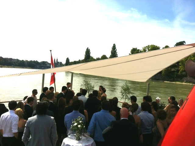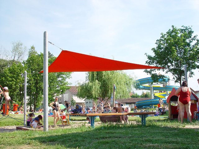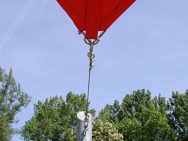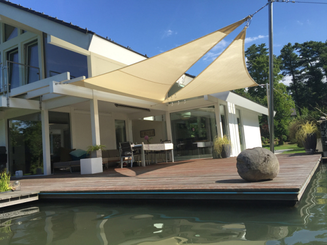 Der konkave Einschnitt sieht nicht nur dynamisch aus, sondern trägt entscheidend zur optimalen Spannung des Sonnensegels Dreieck bei. In den umlaufenden Hohlsaum wird ein Edelstahldrahtseil eingefädelt und zusammen mit dem D-Ring der Zuglasche in das Spannschloss eingehängt. Das Drahtseil versucht, von seiner Physik her, immer gerade zu werden, wird durch den halbrunden Konkavschnitt aber daran gehindert und bringt so Spannung auf die Tuchkanten.