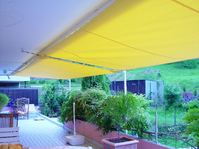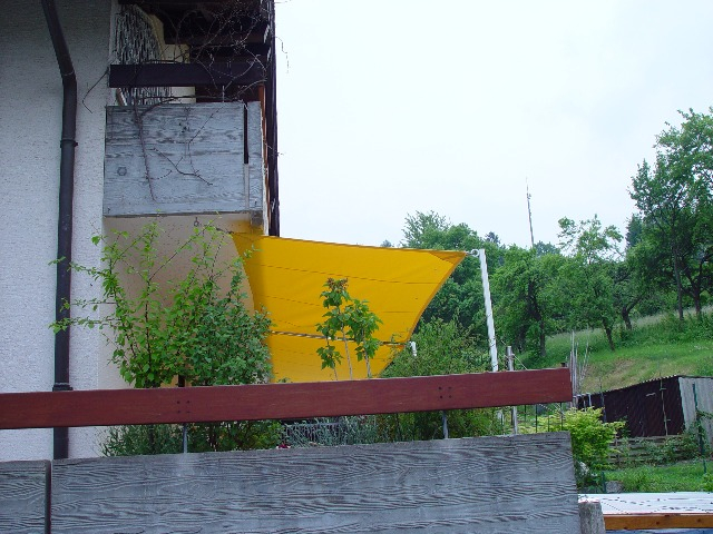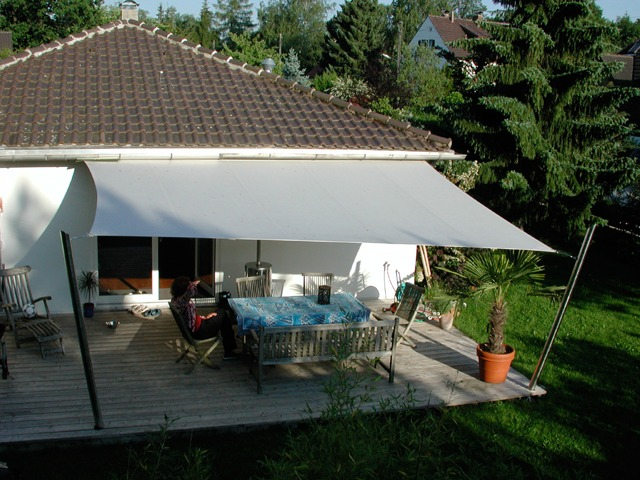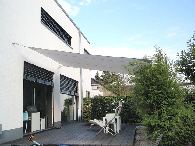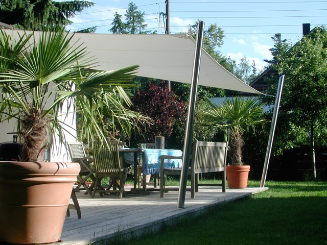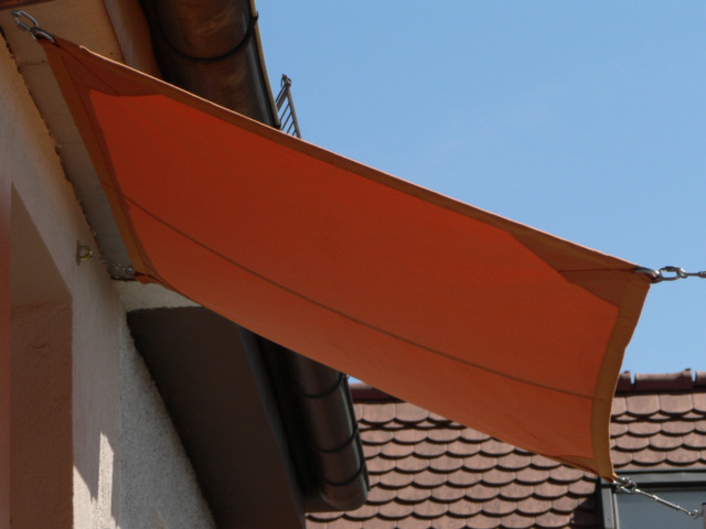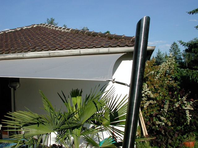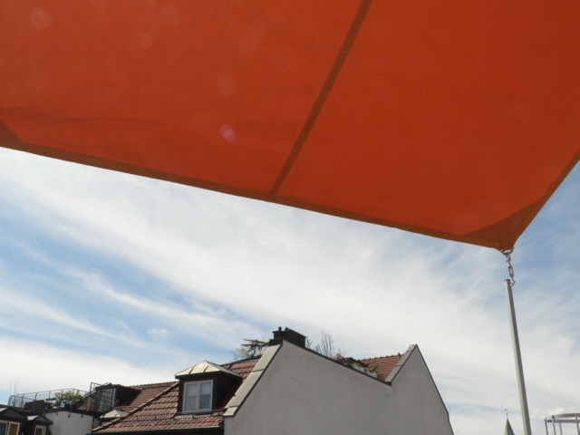 Der nebenher formschöne Konkavschnitt trägt maßgeblich zur optimalen Spannung des Tuches bei. Durch das Edelstahldrahtseil, welches im Saum verläuft, wird der Zug so in alle Richtungen aufgebaut. Ein ordentlich gespanntes Sonnensegel ist Grundlage für einen raschen Regenablauf und eine hohe Windfestigkeit.