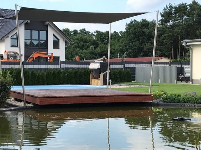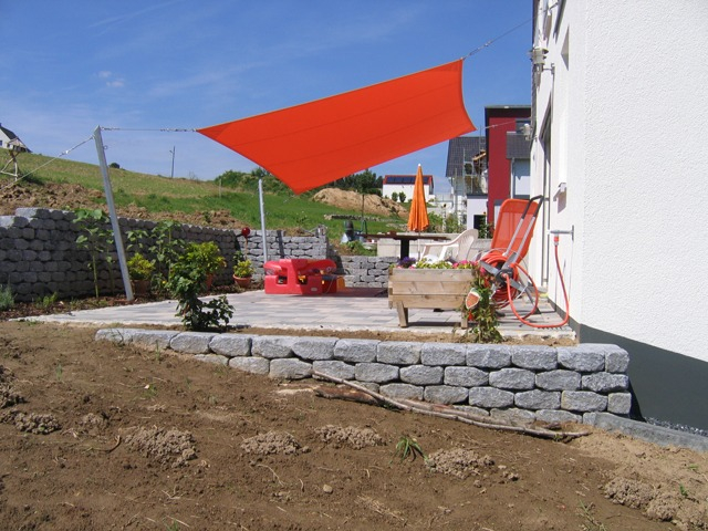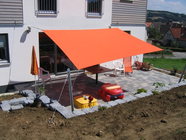 Durch den Saum ringsum wird ein Edelstahldrahtseil geführt und die Seilenden mittels Drahtseilklemmen verbunden. Dadurch kann das Sonnensegel mit Spannschlössern werkzeuglos eingehängt, als auch ausgehängt werden.